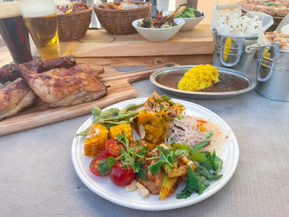 メイン料理のBBQチキンは一人1本までだが、彩り楽しいデリやピッツァ、フライにカレー、食後のジェラートなどが食べ放題となっている。ビールはもちろん、微アル・ノンアルなど、100種類のドリンクが飲み放題。期間限定のpop upイベントが週替わり行われ、何度行っても飽きない催しが用意されている。